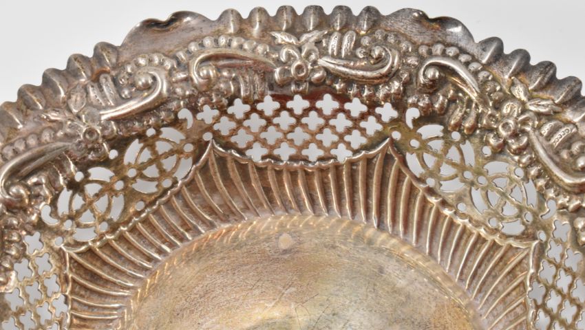 An Edwardian silver dish of oval form having a flared rim with pierced and repousse decoration to the rim. Unmarked but tests indicate silver. Weight 83.4g. Measures 17cm wide.
