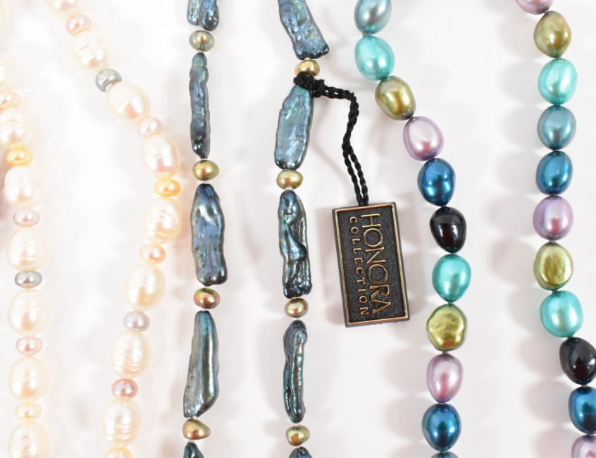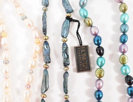 A group of six Honora cultured pearl necklaces to include a string of purple cultured pearls, a blue baroque pearl necklace, a tri coloured necklace etc. All with presentation pouches. Longest measures 62 inches, smallest measures 16 inches.