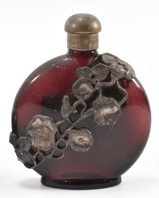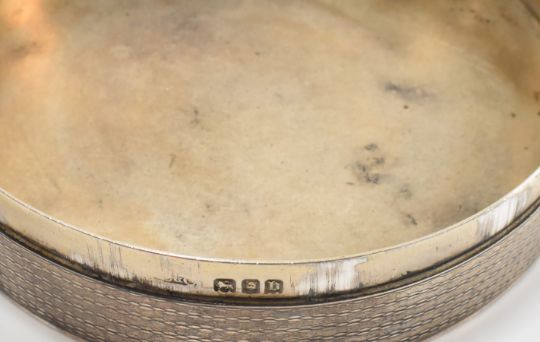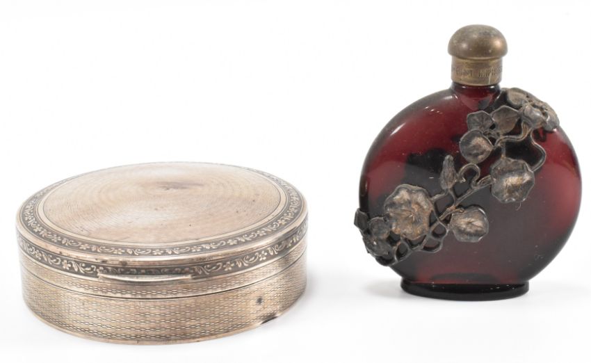 An early 20th Century silver hallmarked dressing table box of round form having engine turned decoration with moulded floral borders, having a mirror to the interior (hallmarked Birmingham 1917, rubbed makers marks, measures 10.5cm) together with a purple glass cent bottle having white metal floral sprays with a screw lid marked First Impressions, made in England (measures 9.5cm tall). Box weight 214.4g.