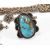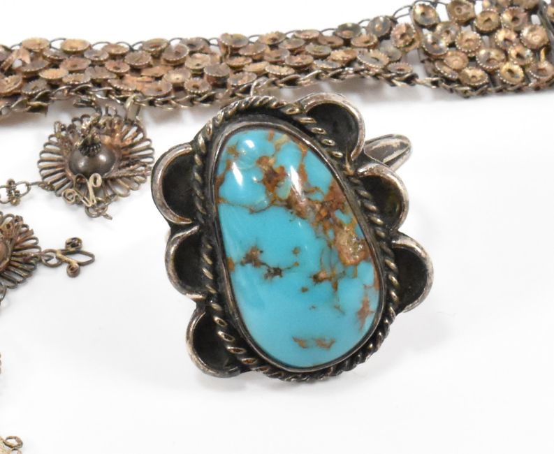 A Native American silver white metal and turquoise ring (unmarked, size P) together with a silver white metal wire work drop necklace having round floral link drops (unmarked, drop measures 9 inches, AF). Total weight 68.8g.