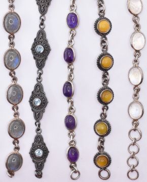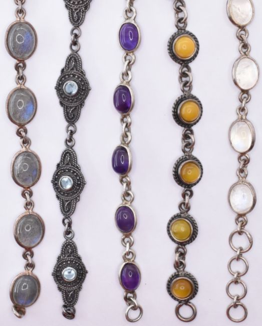 A group of five silver bracelets being stone set to include a labradorite oval stone bracelet, a filigree link bracelet set with blue stones, a yellow stone cabochon bracelet, a moonstone cabochon bracelet, and a purple stone cabochon bracelet. Longest measures 9.5 inches, shortest 7. Weight 37g. Two unmarked. Good condition.