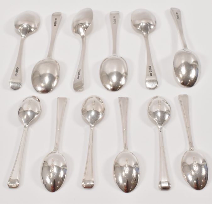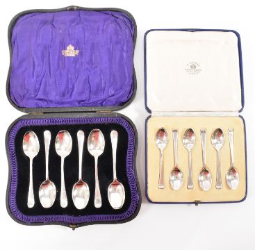 Two sets of six silver hallmarked spoons to include a set of Mappin & Webb Art Deco tea spoons in their original box (hallmarked Sheffield 1939, measures 8.5cm), and a set of Atkin Brothers tea spoons with engraved y initials to the terminals, in J W Benson fitted box (hallmarked Sheffield 1915, measures 10.5cm). Silver weight 112.6g.