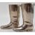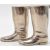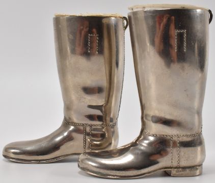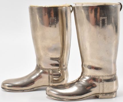 A pair of silver plated salt cellars in the form of wellington boots having raised decoration and plastic liners to the interiors. Stamped Silver Plated to the heel. Measures 9cm tall.