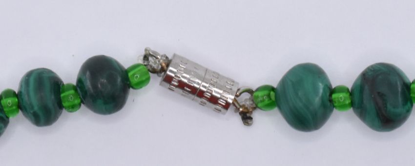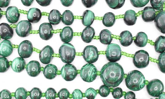Two malachite beaded necklaces each having round graduating beads with green glass spacer beads. Longest measures 30 inches, shortest 22 inches.
