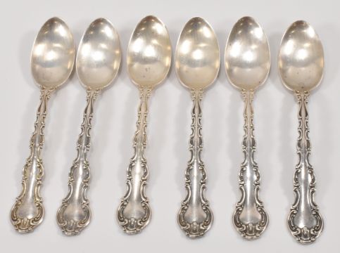 A set of six Gorham Manufacturing Co silver spoons having moulded scrolled borders to the handles. Hallmarked Birmingham 1915. Weight 91.7g. Measures 12.5cm.