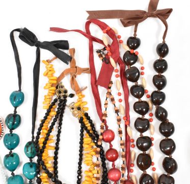 A large collection of costume jewellery to include a malachite bangle, beaded necklaces yellow metal necklaces, mid century brooches, buttons including micro mosaic, earrings, bracelets etc.