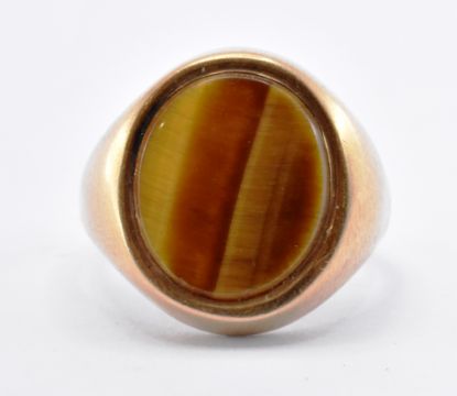 A hallmarked 9ct gold signet ring set with an oval tigers eye panel to the head. Hallmarked Birmingham 1979. Weight 5.6g. Size R. Good condition.