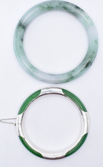Two jade bangles to include a round bangle (measures 19.5cm circumference) together with a silver bound bangle with hinged opening and tongue in groove clasp (marked 925, measures 16.5 circumference).