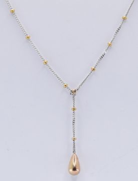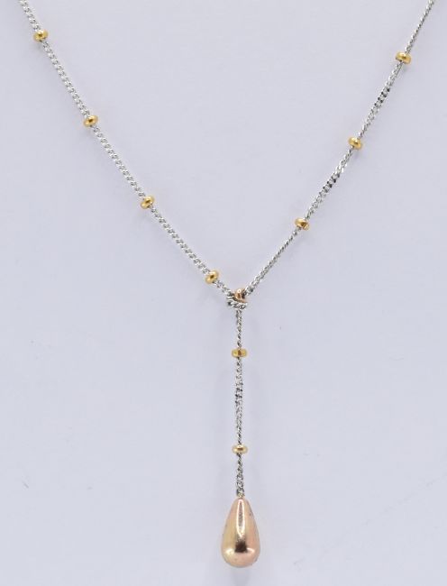 A two tone 9ct gold pendant necklace having a white gold fine link chain with spaced yellow gold accents and a drop shaped pendant suspended from a chain below. Marked 375 IBB. Weight 2.6g. Chain measures 17.5 inches.