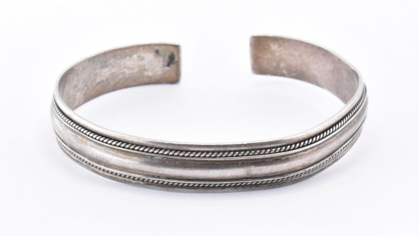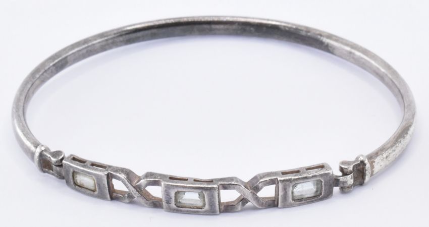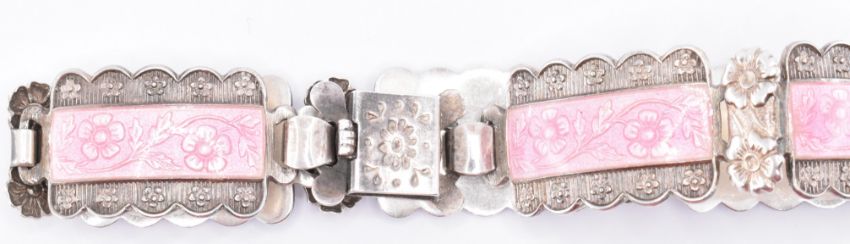 A group of four silver bracelets to include a pink enamelled bracelet having enamel floral decoration (marked Harmony to the clasp and silver to each link, measures 7 inches), two open bangle with rope twist borders (measures 17 and 16.5cm), and a bangle set with three blue stones (17cm circumference, AF). All marked as silver. Weight 58.5g.