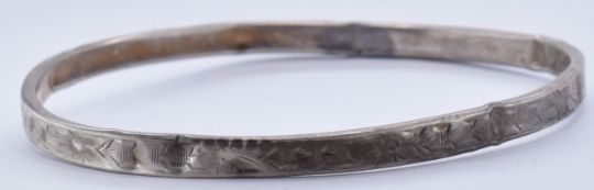 A collection of silver and silver white metal jewellery to include a silver hallmarked brutalist pendant on an oval link necklace chain (hallmarked Edinburgh 1980, makers mark SJW, chain 18.5 inches), silver Canada leaf earrings and brooch (marked sterling silver, earring measure 2cm), a rectangular panel bracelet (marked 800, largest measures 22cm circumference), three silver bangles, and a silver white metal bracelet and brooch set (AF, unmarked). Silver weight 102g.