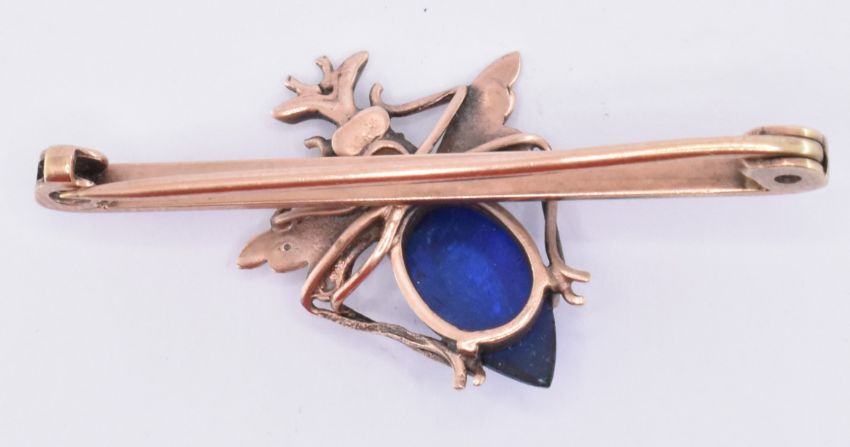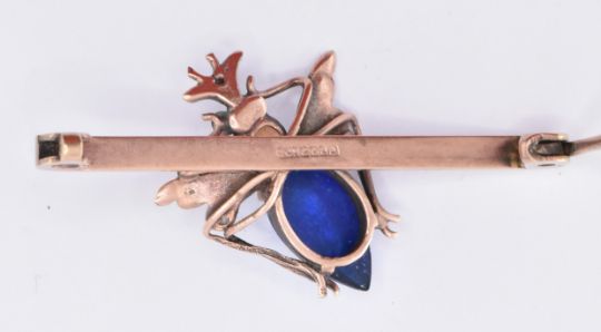 A 19th Century 9ct gold bug brooch having a flat topped bar brooch with an applied insect set with on oval opal cabochon to the head, the wings set with seed pearls and having a foiled glass body. Marked 9ct to the brooch. Weight 5.3g. Measures 4.5cm wide.