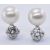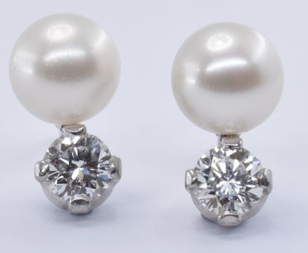 A pair of 18ct white gold cultured pearl and diamond stud earrings each having round cream coloured pearls with prong set brilliant cut diamonds below. Diamonds measure 5.1mm diameter. Marked 750 to the posts. Weight 4.0g.