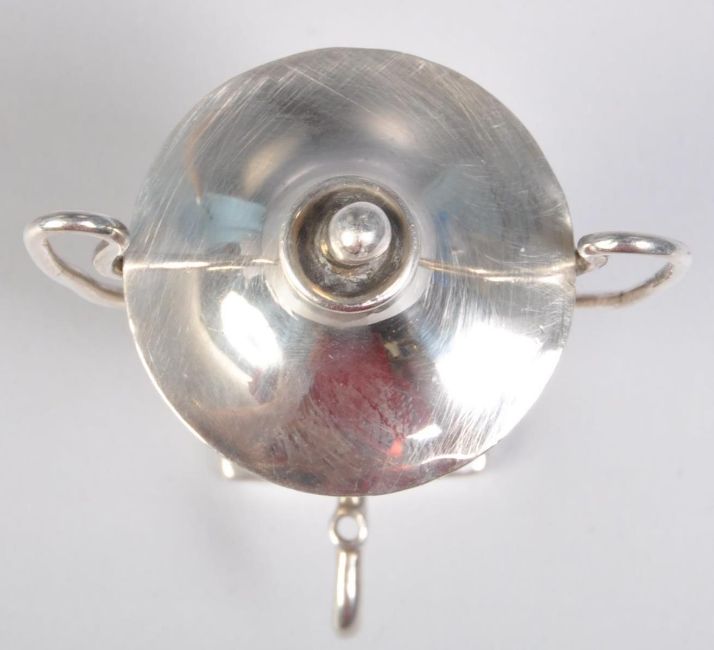 A mid 20th century Thomas Ducrow & Sons silver hallmarked miniature samovar having twin handles and raised on a square base. Hallmarked Birmingham 1954. Weight 21g. Measures 7cm tall.