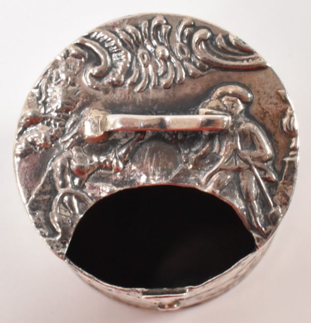A collection of silver items to include a James Deakin & Sons silver pepperette (hallmarked Chester 1908, 8cm), a silver white metal gentleman figurine on a marble base (unmarked but tests indicate silver, 8.5 cm tall), a 19th Century silver vessel having repousse decoration (hallmarked London 1891, AF, 3cm) and a hallmarked silver case (hallmarked Birmingham 1898, 7.5cm). Weight of hallmarked silver 65.9g.