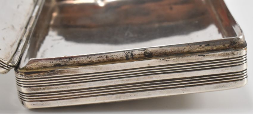 A vintage Dutch silver cigarette box having engraved galloping horses to the lid with engraved striped decoration to the verso. Dutch lion mark and duty mark, makers mark rubbed, no makers mark. Measures 13cm wide. Weight 138g.