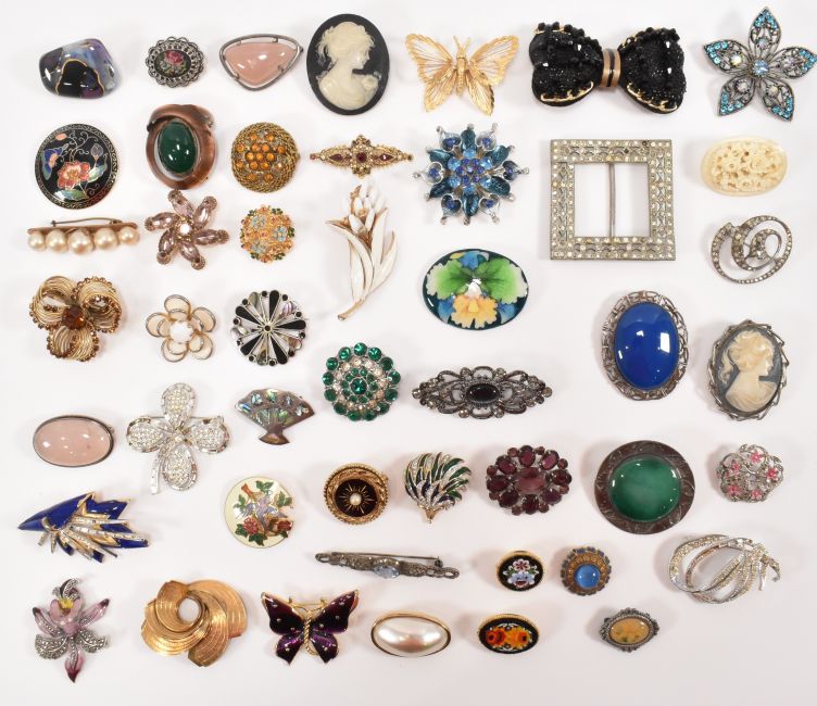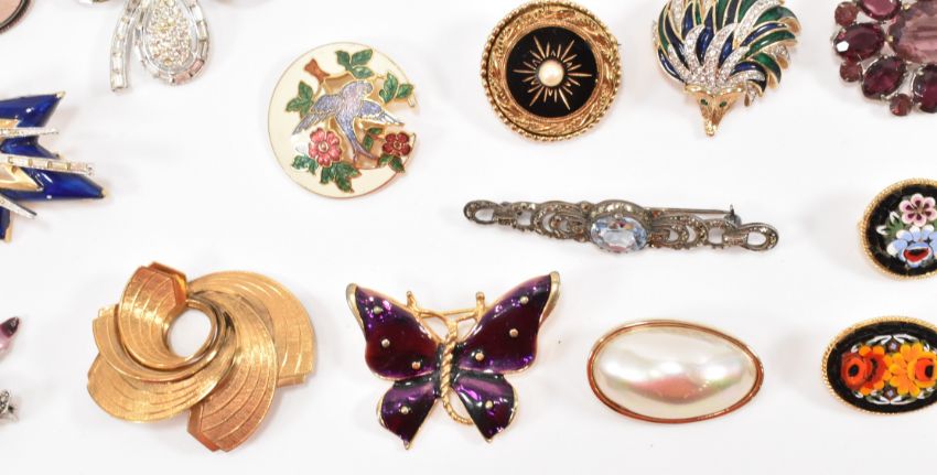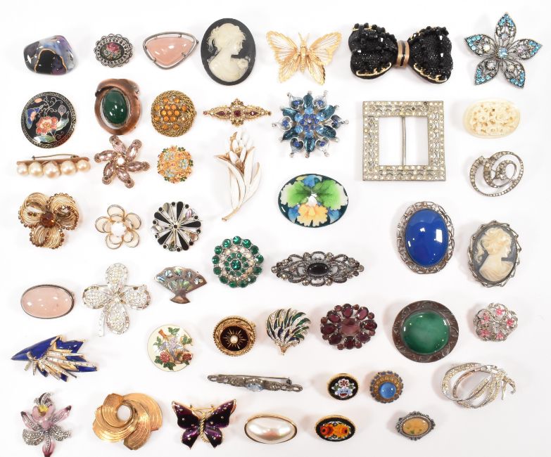 A collection of vintage retro mid 20th Century and later brooches to include coloured stone examples, enamelled examples, cameo brooches etc. Bow brooch measures 7.5cm, small micro mosaic brooch measures 2cm diameter.