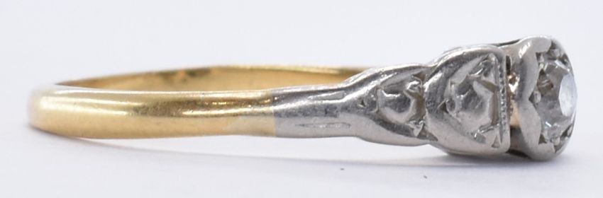 An 18ct gold and diamond ring having white metal shoulders set with a central round cut diamond. Weight 1.5g. Size I.5. Good condition.