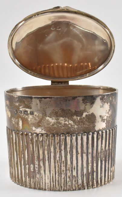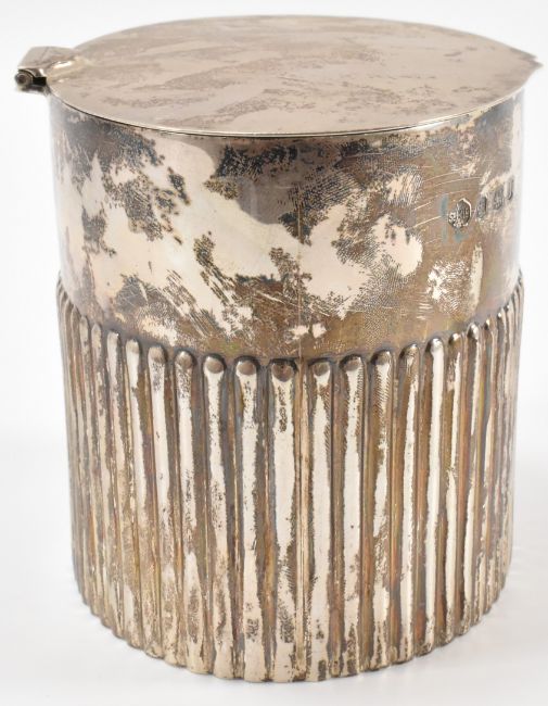A 1920's Art Deco era William Hutton & Sons silver hallmarked lidded pot / tea caddy of oval form with reeded sides. Hallmarked Sheffield 1928. Weight 227.5g. Measures 8.3cm.