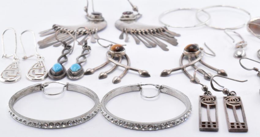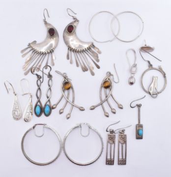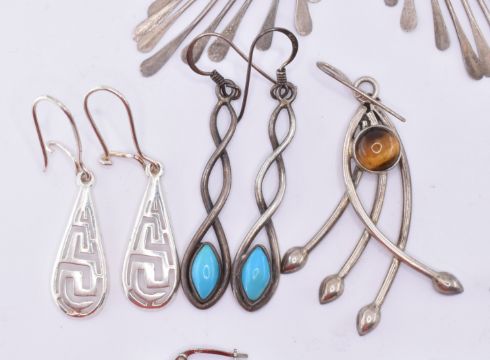 A collection of silver earrings to include a pair of silver hoop earrings set with round white stones, a pair of Mackintosh style pierced drop earrings, a pair of tigers eye drop earrings, a pair of turquoise set drop earrings etc. Most marked 925. Weight 43.9g. Longest measures 7cm, smallest 1.5cm.