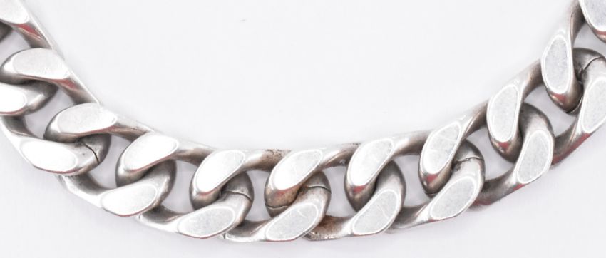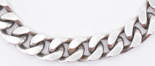 A silver flat curb link bracelet chain. Marked 925, MM. Weight 51.6g. Measures 8.5 inches.