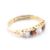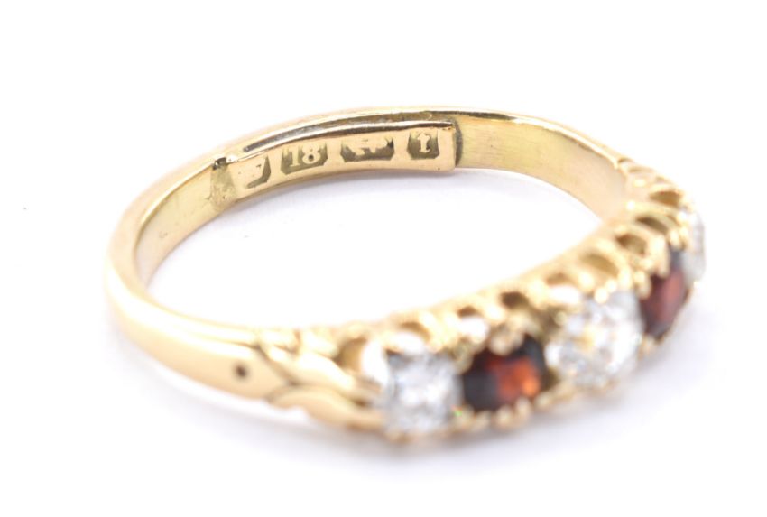 A hallmarked 18ct gold diamond and garnet five stone ring. The ring set with three old cut diamonds (estimated total 0.60ct ) and mixed cut garnets, to foliate stylised shoulders and plain tapering shank. Hallmarked Birmingham 1918. Weight approx 3.4g. Size O.