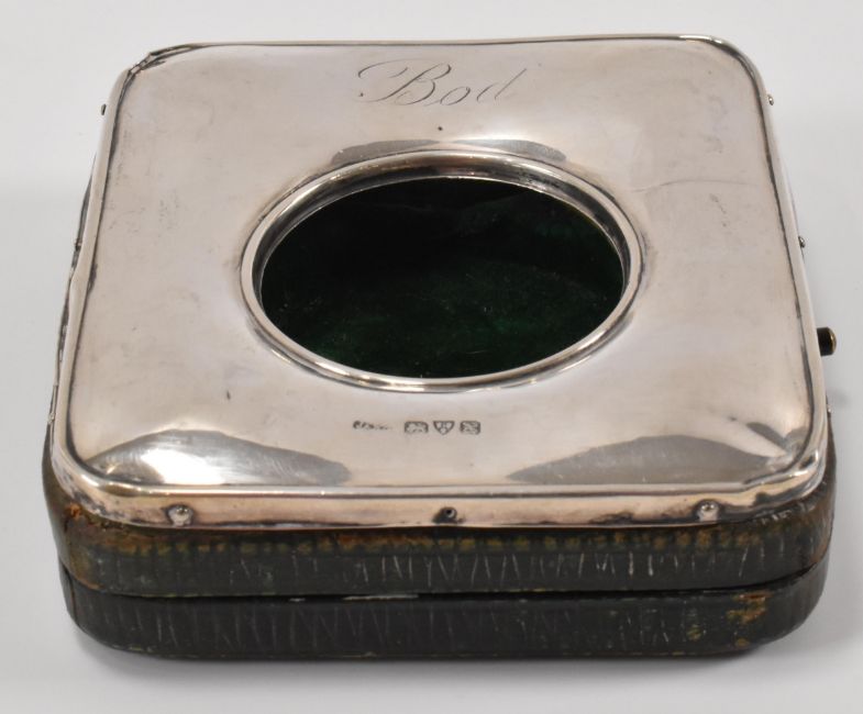 An Edwardian silver hallmarked watch case engraved Bod to the top, with hinged spring release lid and green velvet interior. Hallmarked Chester, 1908. Sponsors marks ineligible. Measures 25mm x 85mm x 85mm. Total weight 68. 22g.