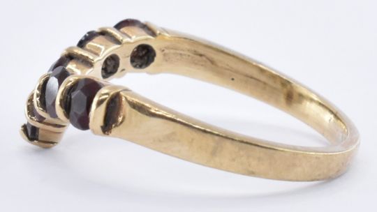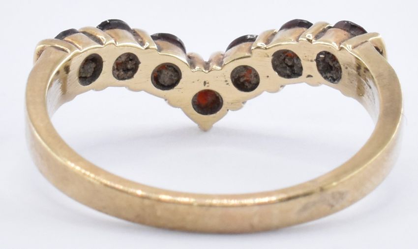 A 9ct gold wishbone ring being channel set with seven round cut garnets. Assay marked London. Weight 2.4g. Size O.