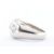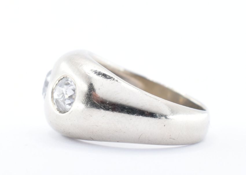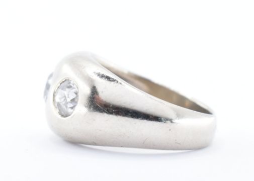 A stamped 14K white gold and diamond gypsy ring. The ring set with three old cut diamonds in a domed rubover setting. Size K / K.5. Total weight 7.09g.