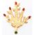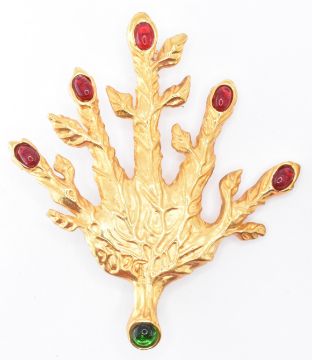 Two Salvador Dali reproduction brooches from the Salvador Dali's art in jewels Joies collection to include a pomegranate heart broch set with red stone cabochons, together with a leaf hand brooch set with red and green stone cabochons. Both marked Dali Joies 2001 to verso. Hand measures 6.5cm.