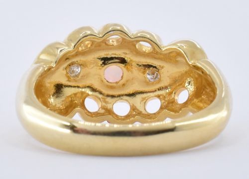 A yellow metal ring set with a scrolled head set with a round opal cabochon flanked by two round cut diamonds. Marked 925 and 18ct. Weight 5.0g. Size P.