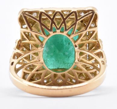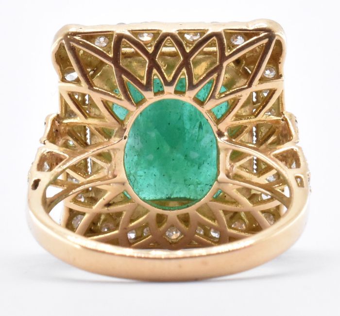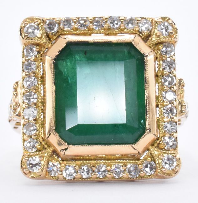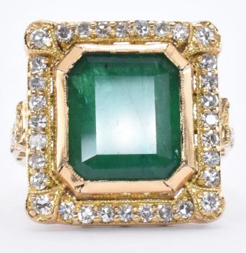 An 18ct gold emerald dress ring. The ring being bezel set with a emerald cut emerald surrounded by round cut diamonds to the head and shoulders. Marked 750 to the band. Weight 7.9g. Ring size O. Emerald measures 11.3 x 9.8 x 6.9mm.