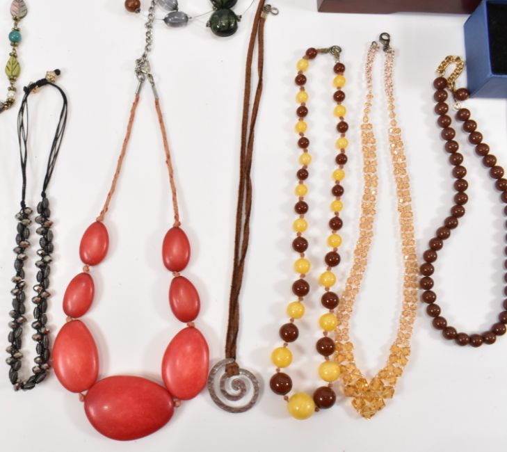 A pair of 9ct golden amethyst stud earrings together with a collection of costume jewellery to include necklaces, pin, earrings. The Jewellery contained in a wooden Chinese lined jewellery box with lock and key.