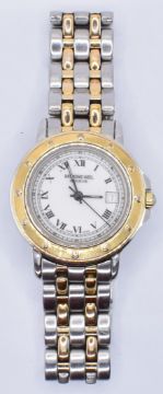 A Raymond Weil Geneve two tone stainless steel wrist watch having a round white enamelled face with arabic numerals to the chapter ring and date aperture to three. Bezel measures 28cm.
