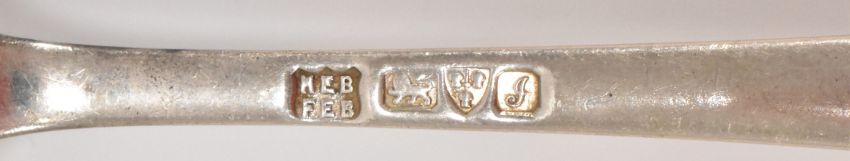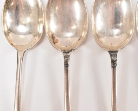 A set of four Edwardian Barker Brothers silver hallmarked table spoons having rat tail bowls and engraved initials 'EH' to each terminal. Hallmarked Chester 1909. Weight 209.4g. Measures 27 cm.