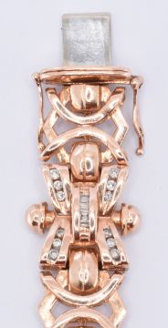 A 14ct rose gold geometric link bracelet being set with rectangular cut and round cut diamonds throughout, with a tongue in grove clasp. Marked 585 to the clasp. Weight 46.3g. Measures 7.5 inches. Additional link also included, measures 3.5cm, weight 7.0g. Total weight 53.3g.