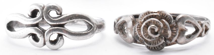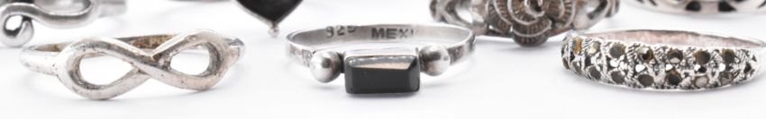A collection of silver rings to include a mother of pearl set ring, an agate cabochon ring, a blue stone and marcasite set ring, amethyst ring, band ring, rose design ring etc. Most marked 925. Weight 42.4g. Sizes range from R - K.5.