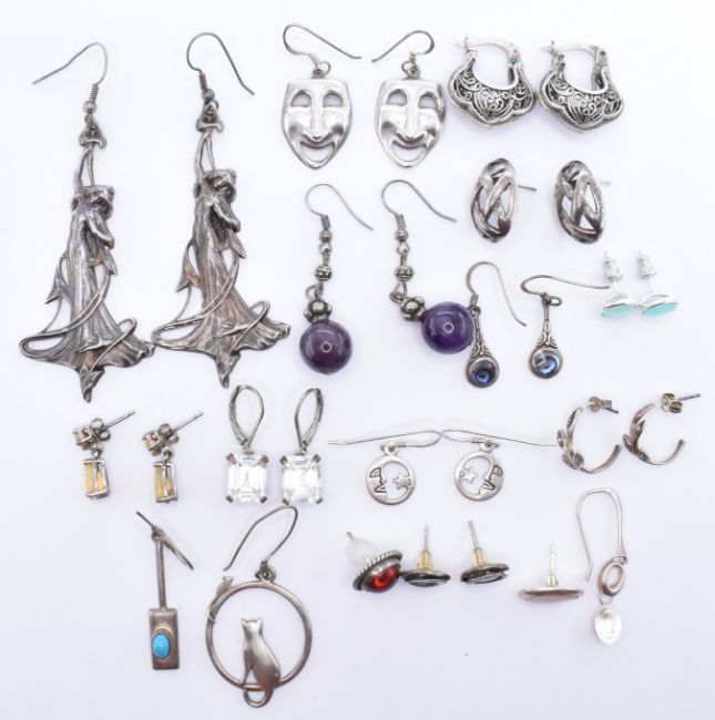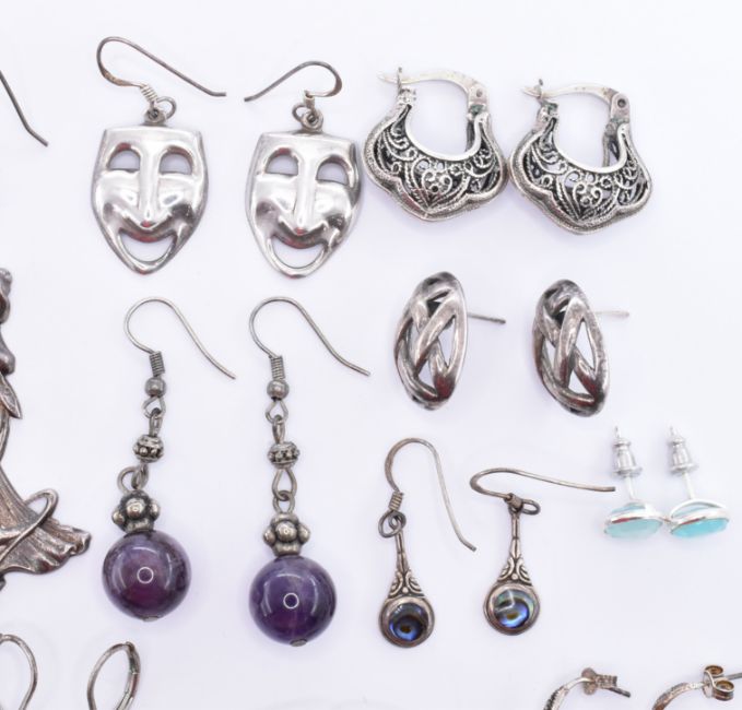 A collection of silver earrings to include a pair of Art Nouveau style fairy earrings, purple stone drop earrings, white stone drop earrings, a pair of opal drop earrings, turquoise drop earrings. Most marked 925. Weight 63.2g. Longest measure 8.5cm.