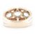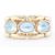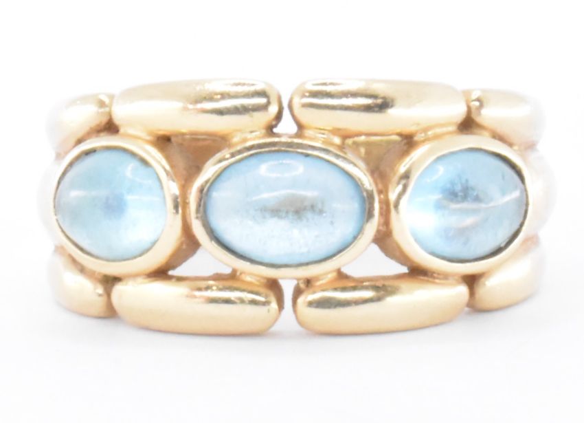 A 14ct gold and aquamarine ring. The ring being set with three aquamarine cabochons within a link design head with reeded shoulders. Marked 14k. Weight 5.8g. Size O.