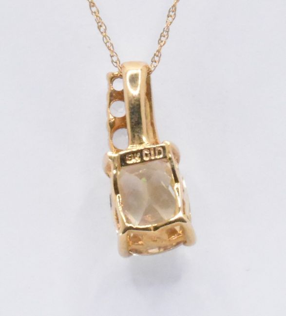A 9ct gold and citrine pendant necklace having a fine link chain set with a faceted rectangular citrine with three graduating white stones set to the bale. Chain marked 375, pendant marked 9k. Stone measures approx 9mm high, chain measures 17 inches. Weight 1.8g.