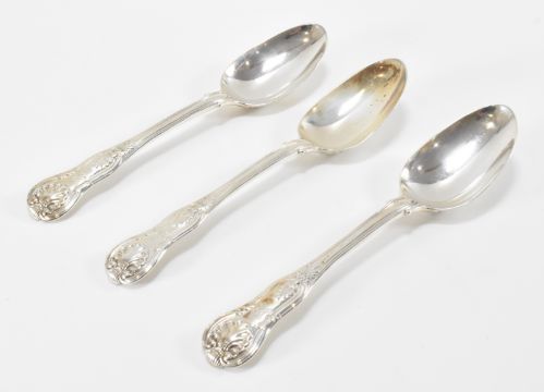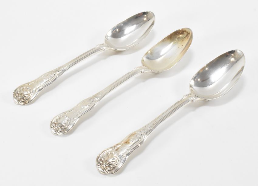 A collection of three hallmarked silver George IV dessert spoons, all having moulded palmette motifs to the terminals. Makers mark WC for William Chawner II. Hallmarked for London. Date letter k for 1925. measures 18cm in length. Total weight 171g.