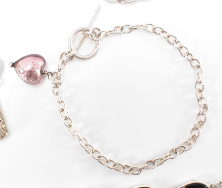 A group of silver bracelets to include a chain bracelet with glass bead heart charm, a bracelet with filigree moulded links and a stone set bracelet having black stone panels set within the links. Longest measures 18cm in length. Total weight 73.9g.