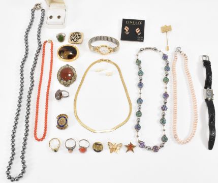 A collection of vintage costume jewellery to include simulated pearls, freshwater pearls on a white metal clasp, dress watches, stud earrings, clip earrings. Yellow metal flat link necklace, gold clasp faux coral necklace, brooches, badges, stick pin and a collection of silver dress rings to include cabochon, tigers eye set and others. Coral necklace measures 46cm in length.