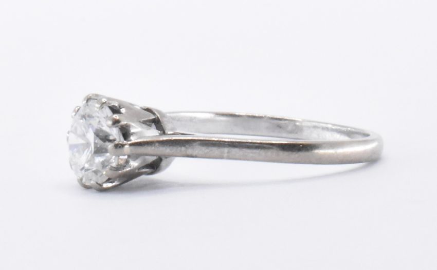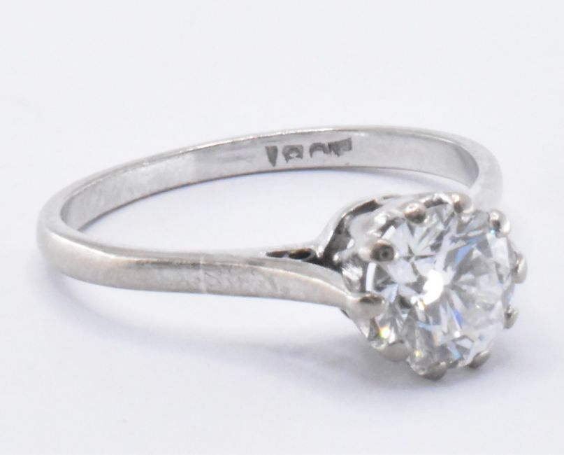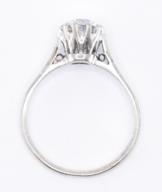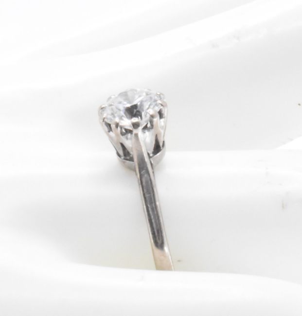 An 18ct white gold and diamond solitaire ring. The ring being prong set with a round brilliant cut diamond in a cathedral setting. Band marked 18ct. Diamond estimated 1.2ct, measures 6.8 x 4.3mm. Clarity estimated VS - VVS , colour estimated E - G. Weight 3.5g. Size Q.5. Good condition.