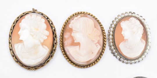 An assortment of vintage mid Century continental  jewellery to include a micro mosaic panel bracelet and matching brooch, four carved cameo brooches, an silver articulated marcasite and pink stone dress clip, a green stone cluster brooch and small yellow metal enamelled cameo box. Box measures 7.5 x 4cm.