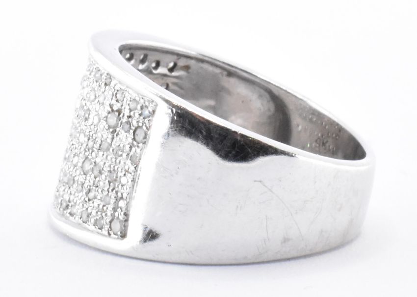 A hallmarked 9ct white gold and diamond ring. The head being pave set with round cut diamond accent stones. Assay marked Birmingham. Weight 5.7g. Size N.
