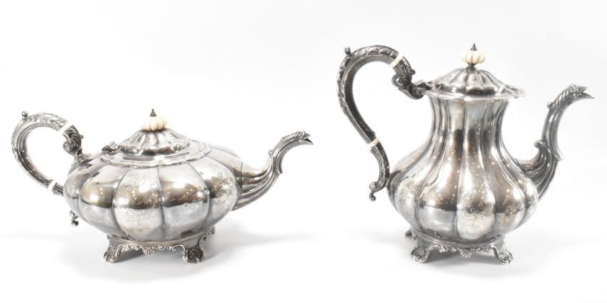 A 1960s silver hallmarked Barker Ellis Silver Company tea set. The set having gadrooned bodies with scrolled acanthus leaf handles, carved bone finial handles and engraved floral details. The service to include tea pot, hot water pot, creamer jug and sugar bowl. Hallmarked Birmingham 1966. Water jug measures 21.5cm tall, tea pot measures 15cm, sugar bowl measures 11cm tall. Total weight approx 3100g. Together with a silver plated serving tray and tea strainer.