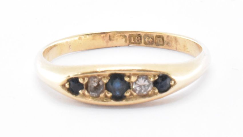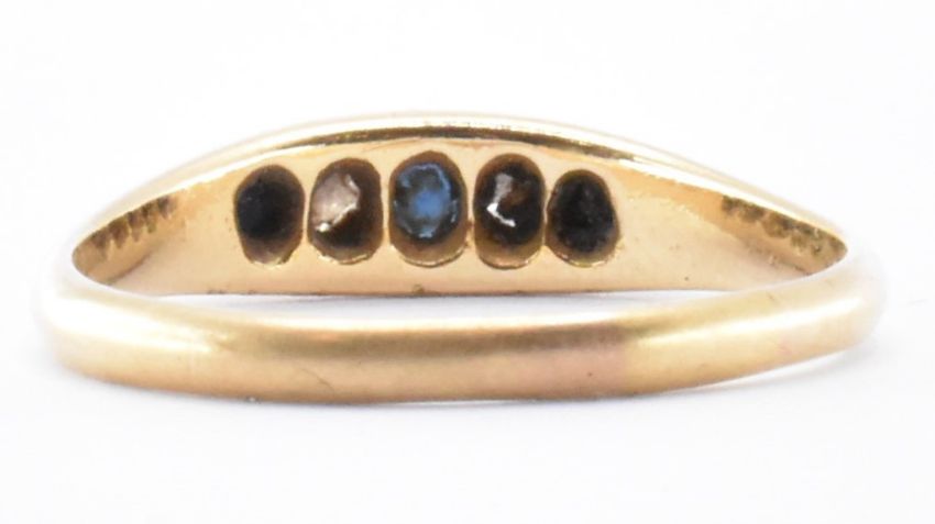 A 19th Century Victorian hallmarked 18ct gold diamond and sapphire five stone ring. The antique ring mount being set with three round cut sapphires and two round cut diamonds. Hallmarked London 1886. Weight 3.5g. Size S.