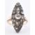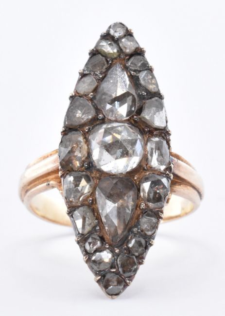 A gold and diamond navette ring set with a cluster of twenty three old cut diamonds with a rose cut diamond to the centre flanked by two pear cut stones with yellow gold scrolled reeded shoulders. Unmarked but tests indicate 18ct gold. Weight 6.9g. Size K. Head measures 2.8cm. Rose cut diamond measures 5.7mm.