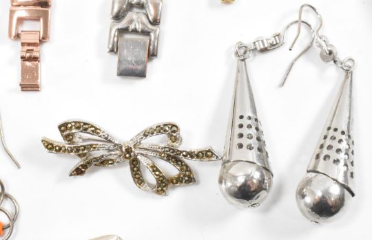 A collection of vintage costume & fashion jewellery to include wrist watches with makers such as Thomas Clarke, Petras, Argento and Sekonda, alongside bangle bracelets, beaded necklaces, a boxed St Justin pendant necklace, drop earrings and white metal brooches.
